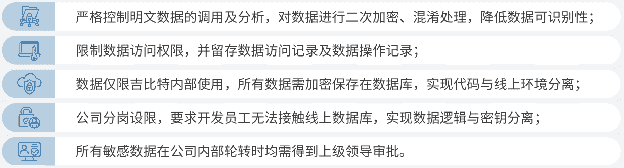 公司对用户个人信息实施脱敏处理,,严格限制用户信息用途,,数据使用完成后集中归档处理。。为进一步确保数据处理过程的安全,,,,公司根据实际的业务工作分岗设限,,最大程度保护数据隐私安全,,如在生产网络中的加密数据由研发部门员工负责编写加、、解密程序,,但其无法直接访问到加密后的数据库;程序的加、、、、解密密钥由运维员工单独配置。。。。